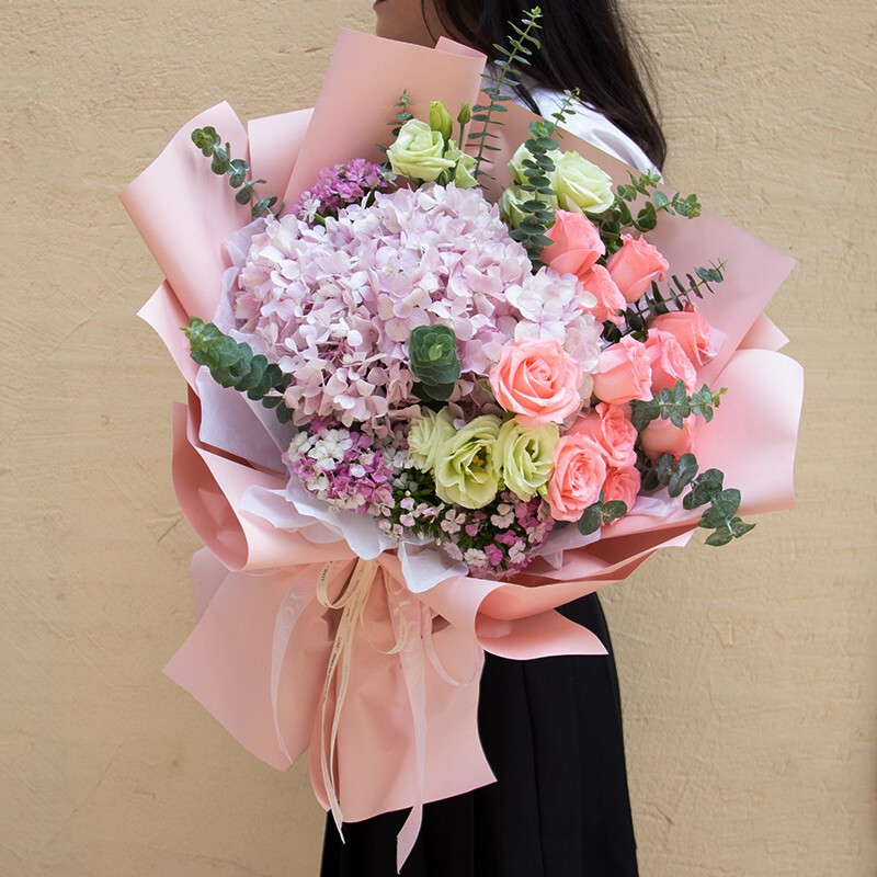 【愿得一人心】1支粉色绣球花,11朵粉玫瑰,搭配3支洋桔梗,石竹梅,尤加利叶装饰。