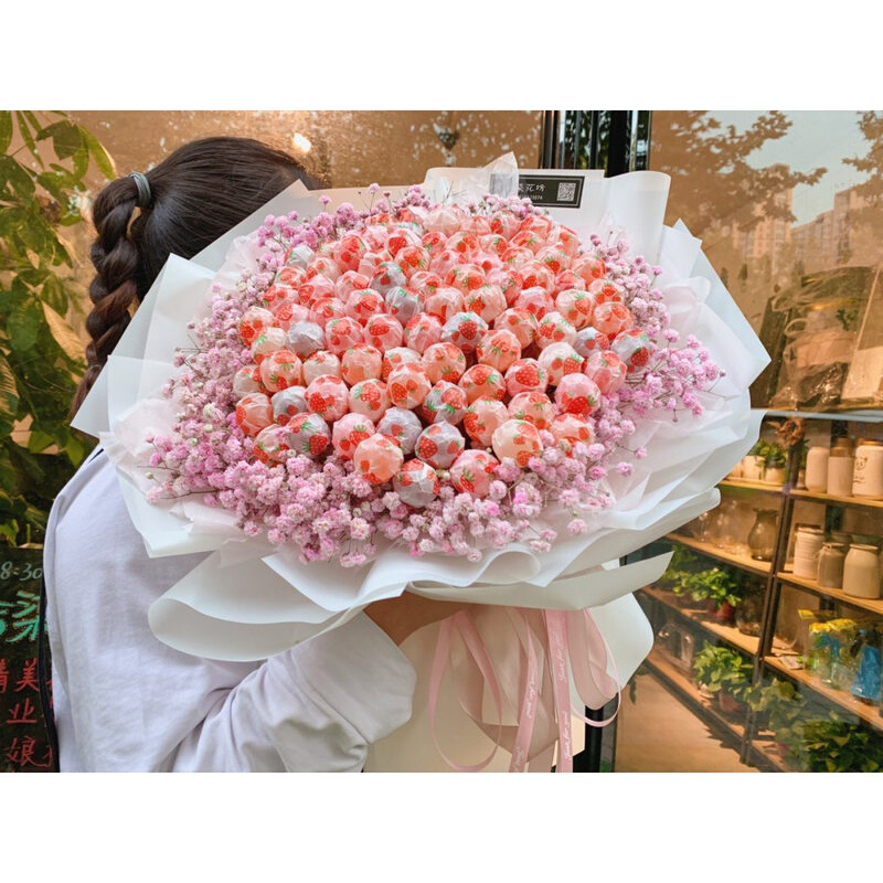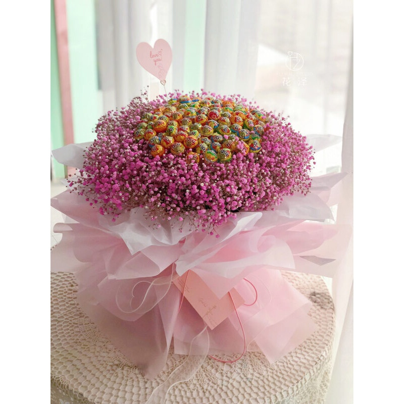 【恋爱泡泡】99颗棒棒糖,搭配粉色满天星外围环绕 。
