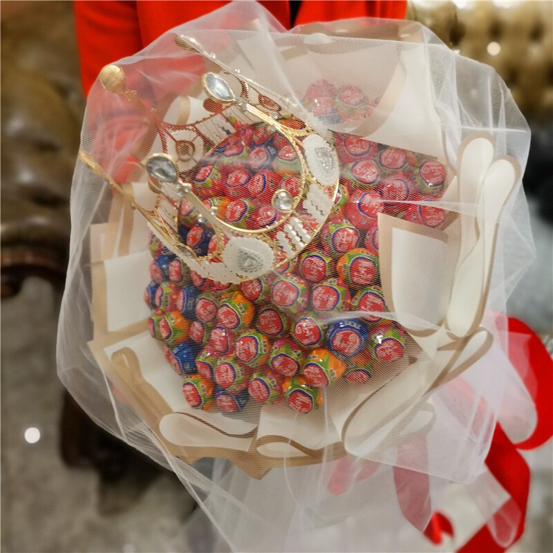 【可爱女人】99颗棒棒糖,搭配1个皇冠,2个灯带。(若红色棒棒糖断货,则每颗外围用红纸包),黑色纸围边,黑色网纱包扎。花束表面黑色英文缎带花结,整体红色缎带花结。
