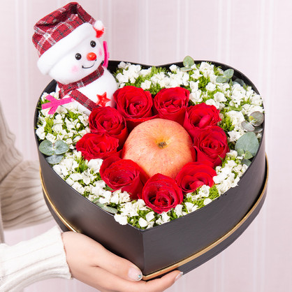 【爱得彻底】红苹果3颗,红玫瑰11朵,搭配适量白色满天星、绿叶装饰。