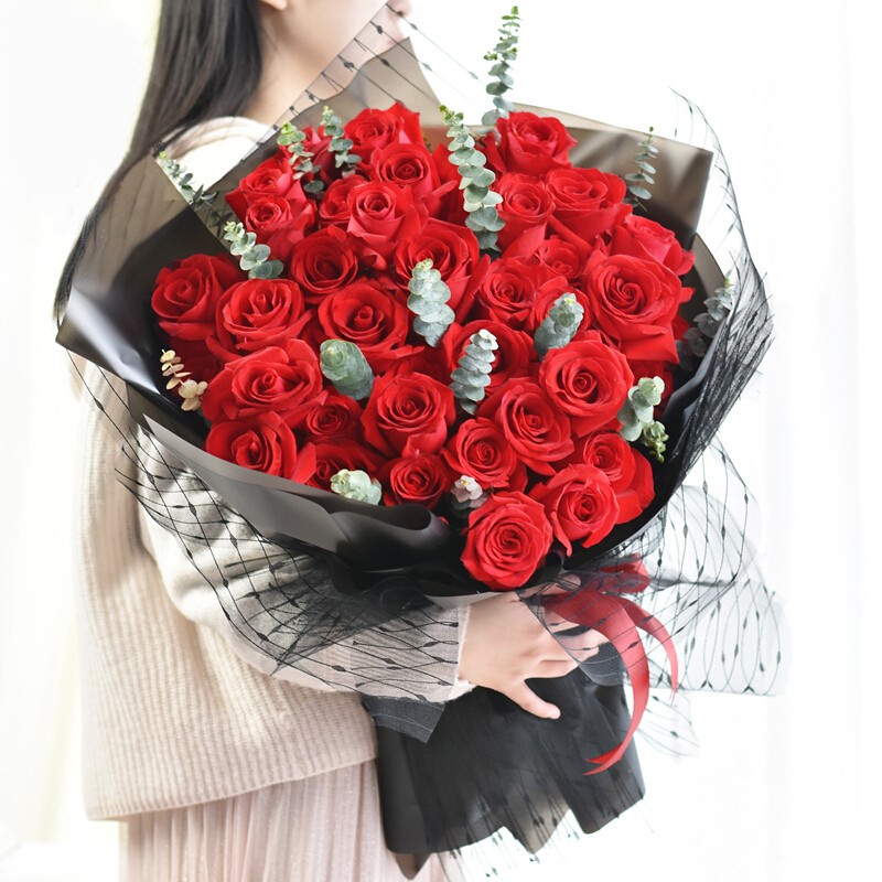 【爱的光芒】33朵红玫瑰,进口尤加利叶装饰。