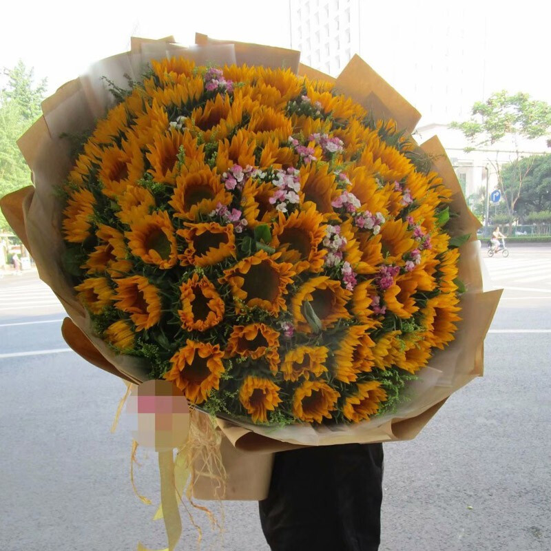 【暖暖情义】精选99朵向日葵,相思梅点缀,牛皮纸外包,同色系香槟色花结。