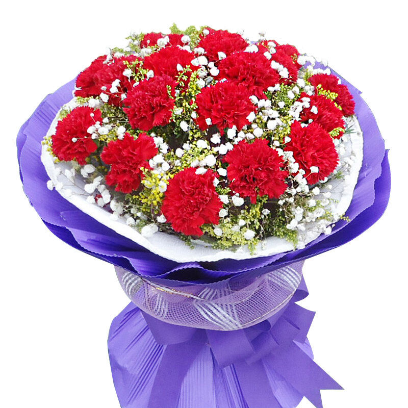 【开心祝福】 11朵红色康乃馨,8朵红玫瑰,黄莺点缀,石竹梅间插。
