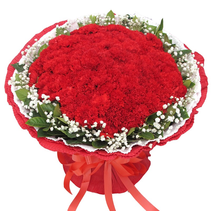 【花开似锦】99朵红色康乃馨,白色满天星、栀子叶外围环绕。