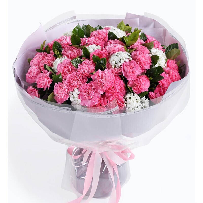 【宜家宜室】精选33朵粉色康乃馨,搭配白色相思梅,栀子叶装饰。