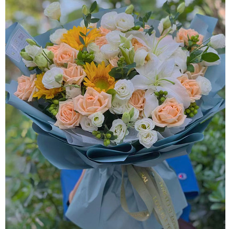 【勿忘我】19朵香槟玫瑰,2支多头白色香水百合,3朵向日葵,9支白色洋桔梗(断货则用9朵白玫瑰代替),搭配尤加利叶装饰。
