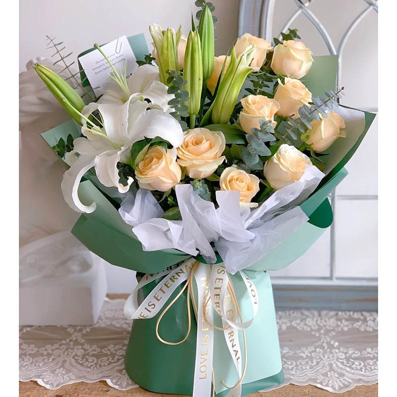 【宁静致远】11朵香槟玫瑰,4支白色多头香水百合,搭配白色满天星丰满间插,尖角造型。