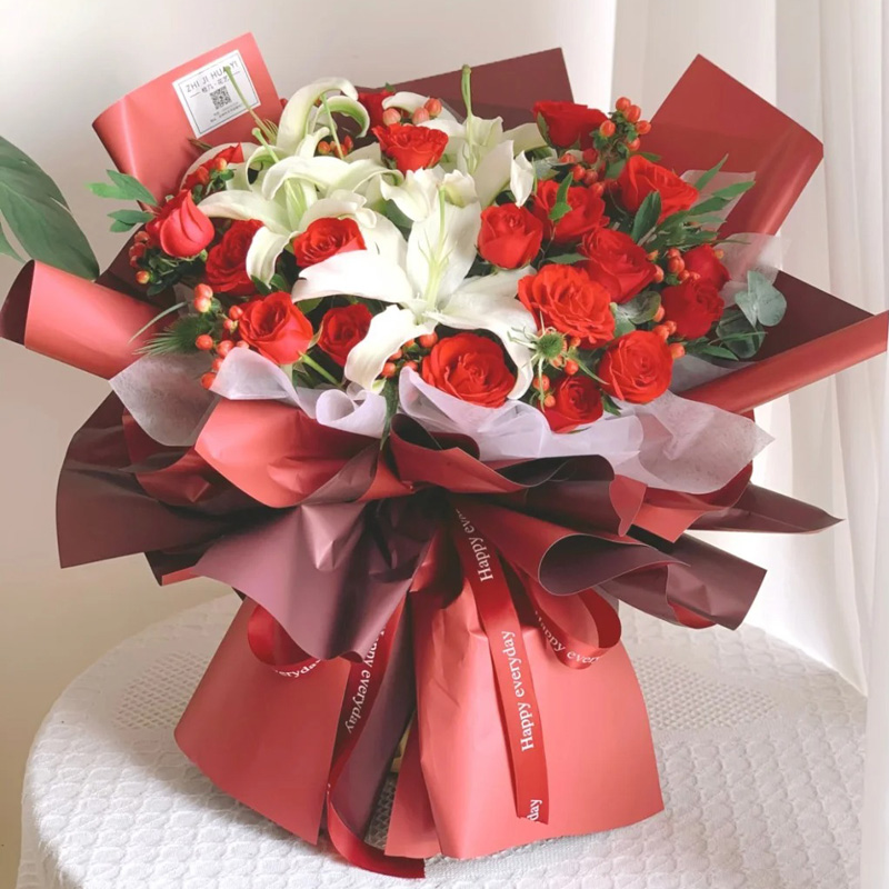 【愿安好】6朵粉玫瑰,3朵白玫瑰,5支白色多头香水百合,搭配4支洋桔梗,尤加利叶装饰。