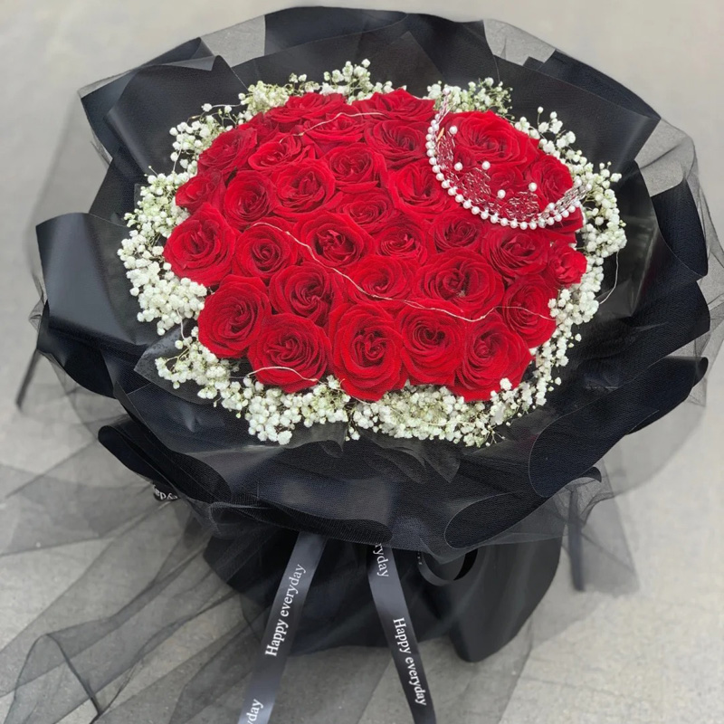 【爱你的宝贝】33朵红玫瑰,1条灯带,1顶皇冠(样式随机),搭配满天星环绕。