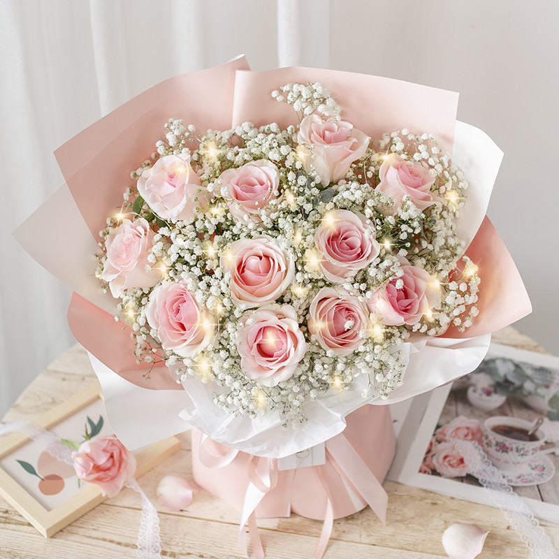 【念星也念你】11朵粉玫瑰,1条灯串,搭配满天星装饰。