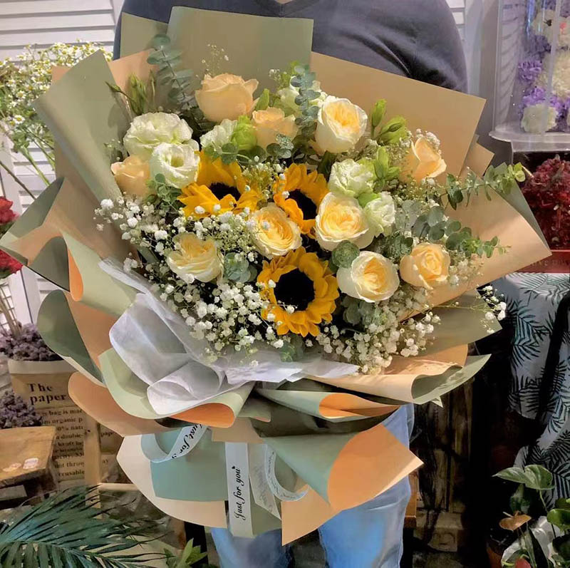 【南歌唱晚】3支向日葵,8朵香槟色玫瑰,搭配3支白色洋桔梗(断货则用3朵白玫瑰代替),尤加利叶、满天星装饰。