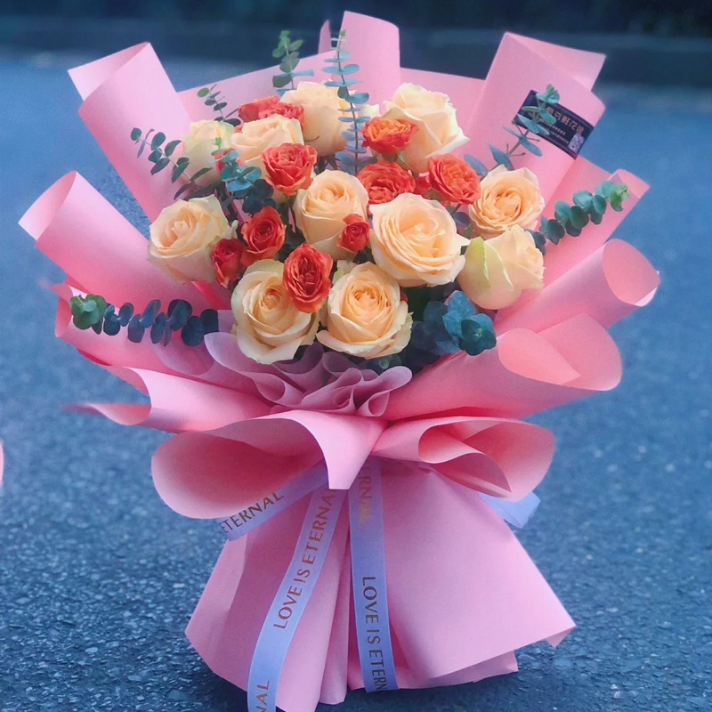 【美好的你】11朵香槟玫瑰,4支多头橙色小玫瑰,搭配尤加利叶装饰。