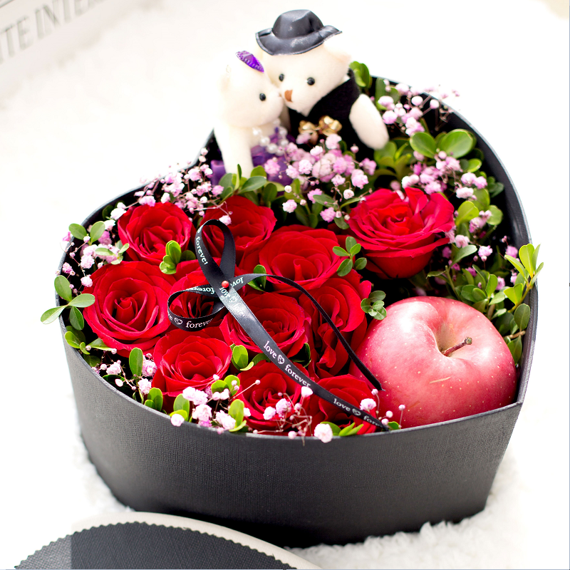 【平安祝福】11只精品红玫瑰,可爱小熊2只,平安果1个,花面蝴蝶结装饰,搭配石竹梅、满天星、绿叶。