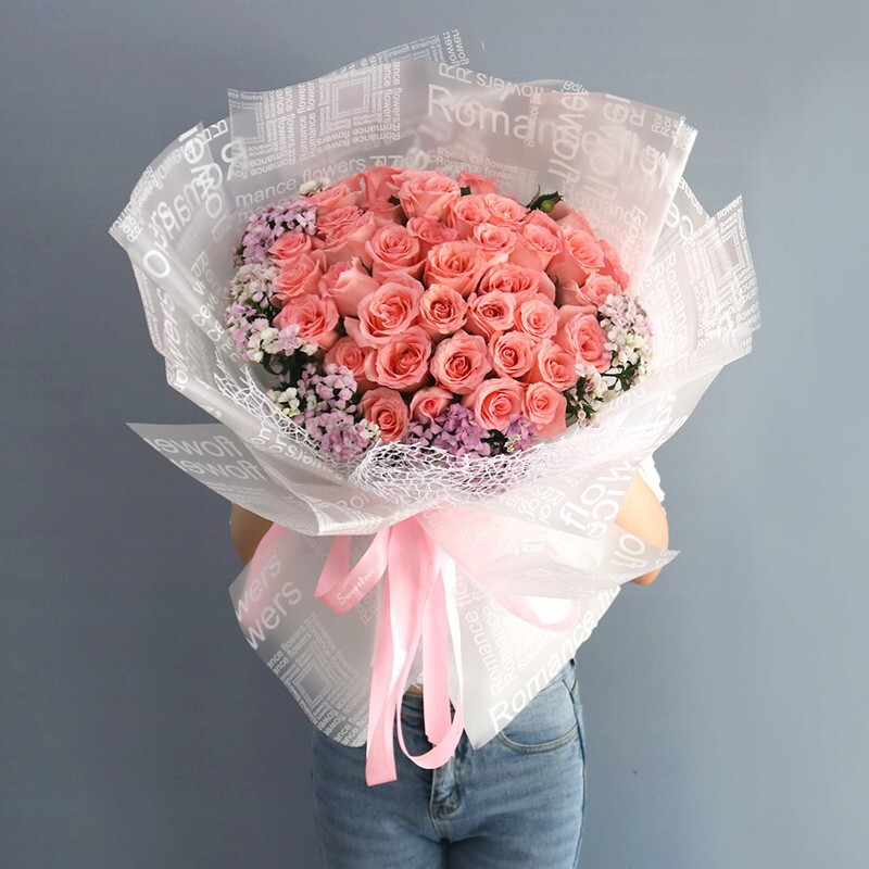 【缪斯女神】33支精品粉玫瑰,外围搭配适量相思梅。