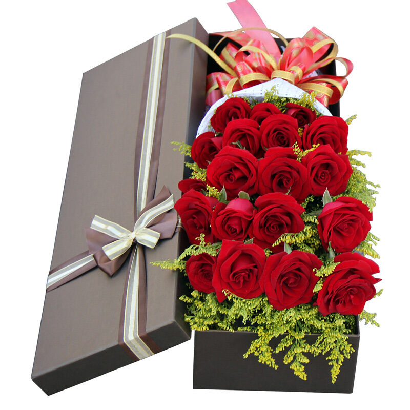 【钟爱一生】精选19支精品红玫瑰,黄莺间插,丰满装饰。