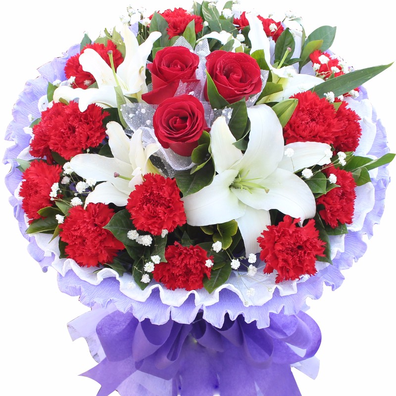 【最好的时光】16支红色康乃馨,3朵红玫瑰,2支白色多头百合,搭配适量满天星、绿叶。