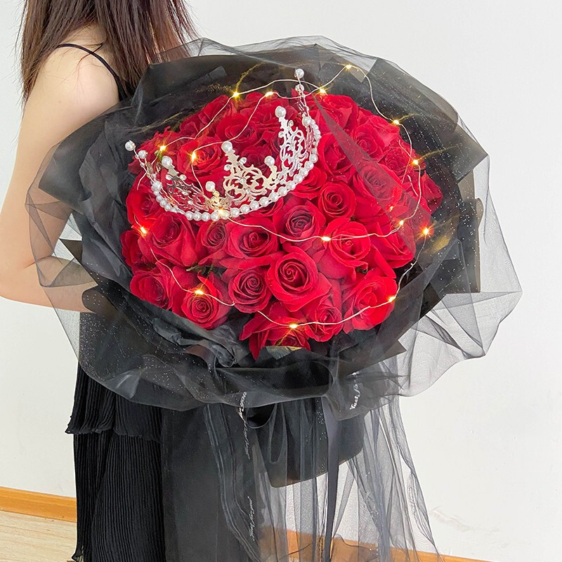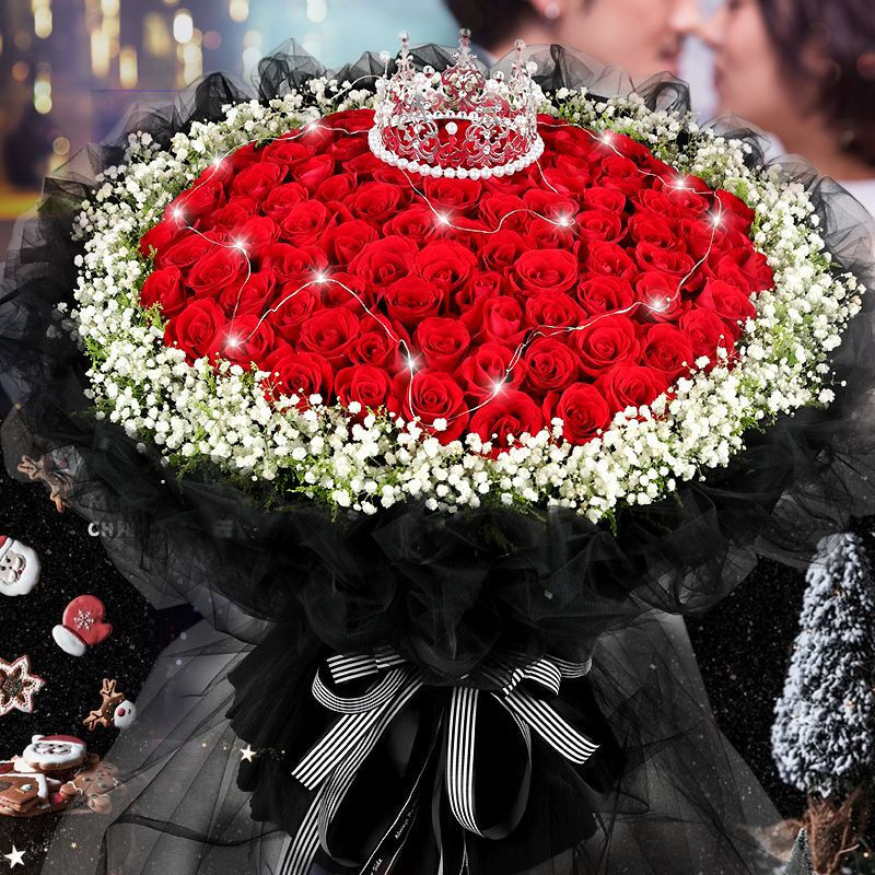 【黑夜之光】99支顶级红玫瑰,搭配皇冠、灯带装饰,满天星环绕。