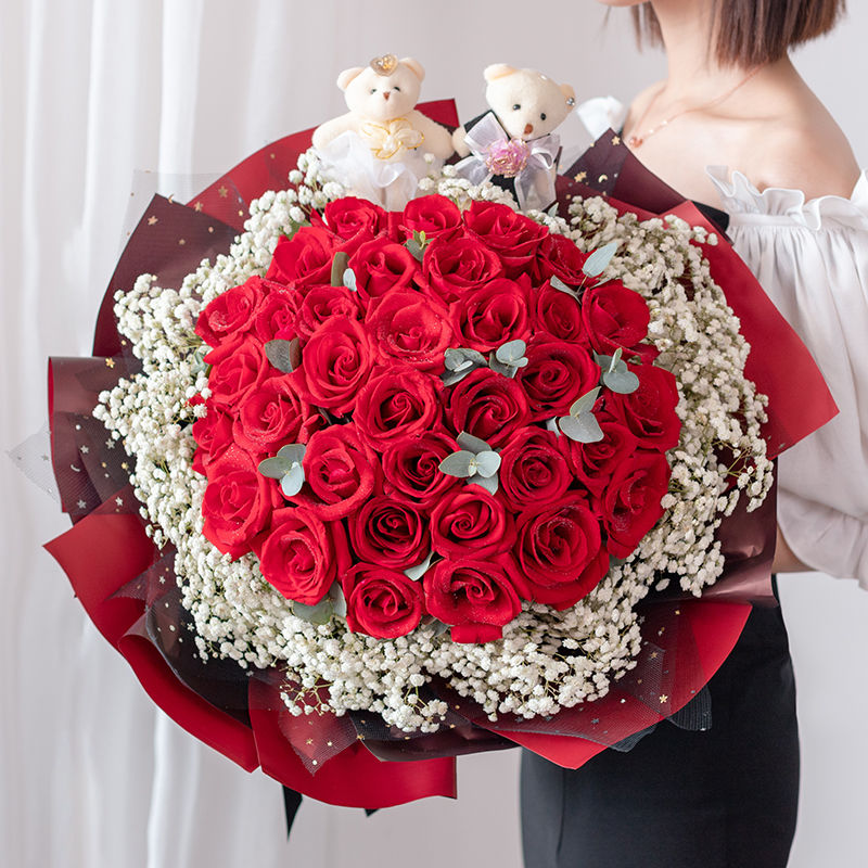 【情深意长】精选33支红玫瑰加两只小熊,满天星、黄莺搭配。