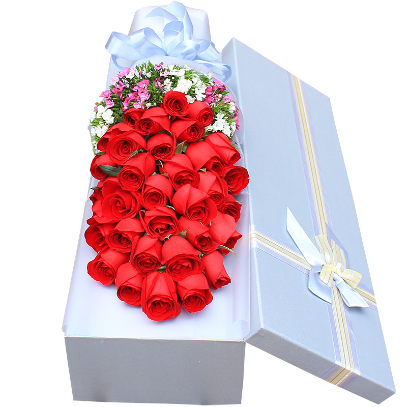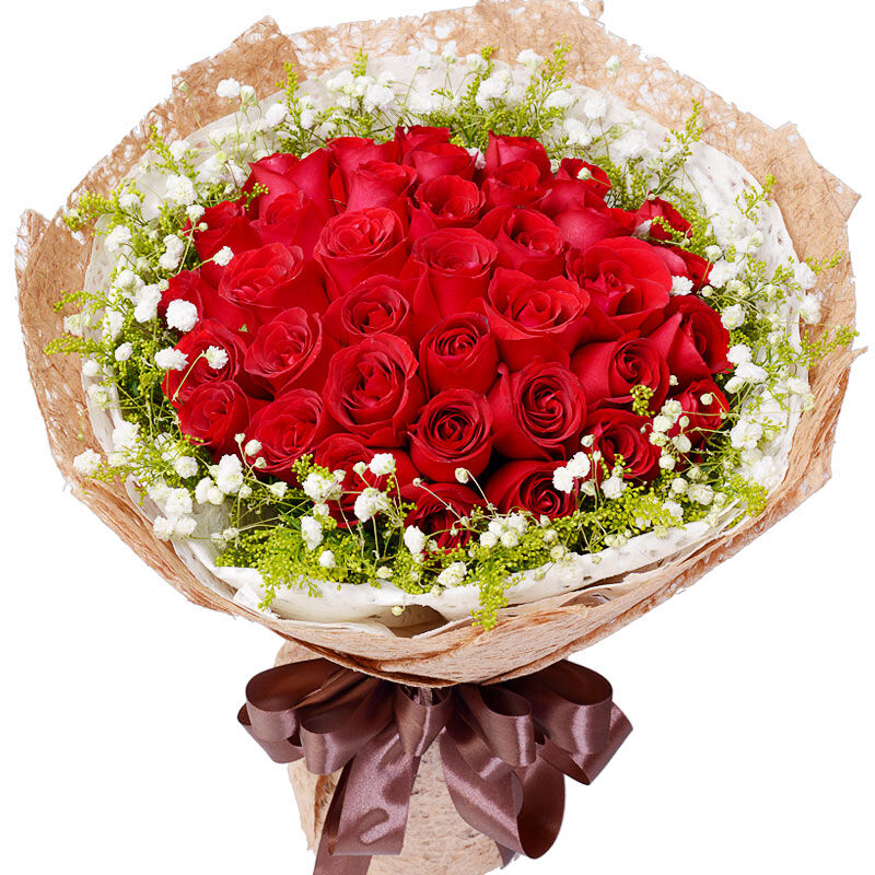 【你是我的幸福】33支精品红玫瑰,外围搭配适量红色、粉色、白色石竹梅。