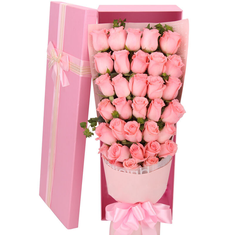 【持久的爱】33朵粉玫瑰,1条灯带,1个白色缎带蝴蝶结装饰花面,洋甘菊间插(若洋甘菊断货,则用白色满天星或者洋桔梗代替)。