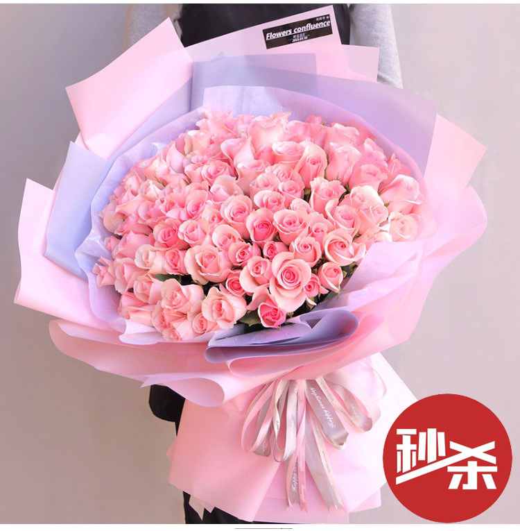【情投意合】精选99朵粉玫瑰,1条缎带系蝴蝶结装饰花面。