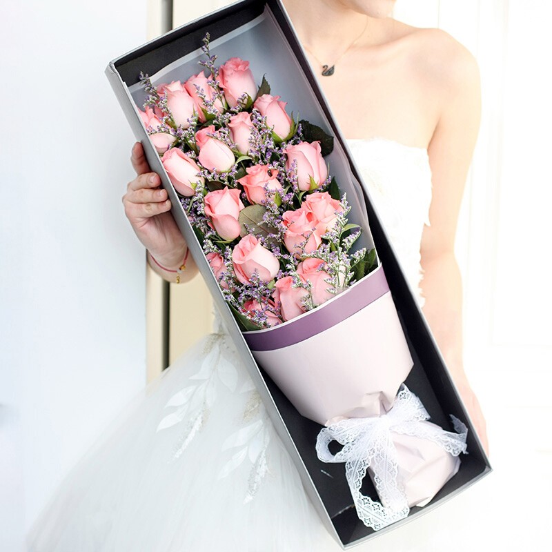 【浓浓深情】精选11朵粉玫瑰、8支洋桔梗(断货则用8支白玫瑰代替),尤加利叶、洋甘菊装饰。