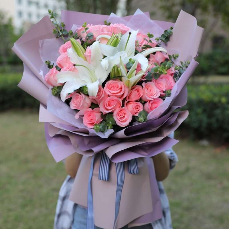 【真情实感】精选33支粉玫瑰,2支白色多头香水百合,搭配适量尤加利叶装饰。
