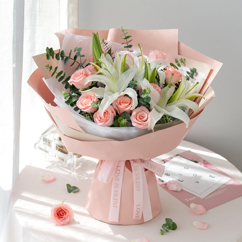 【四月天】精选11朵粉玫瑰、多头白色香水百合2枝、尤加利叶装饰。