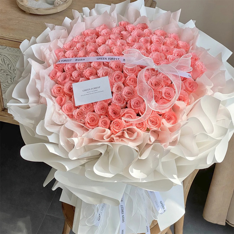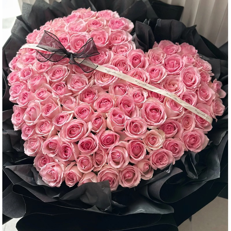 【灿烂心情】99朵粉玫瑰,心形造型,1条白色缎带,缎带上系黑色蕾丝蝴蝶结装饰花面。
