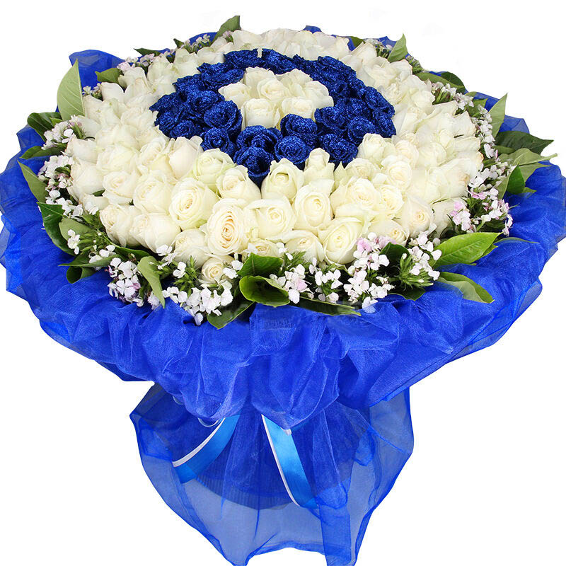 【相知相守】精选99朵顶级玫瑰(30朵蓝玫瑰,69朵白玫瑰),栀子叶,相思梅围绕。