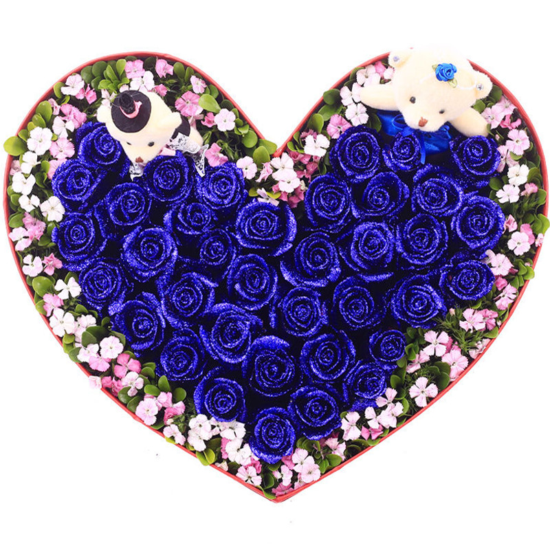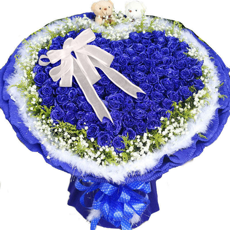 【蓝色爱恋】99支精品蓝色妖姬+2只可爱小熊,爱心形状,外围搭配适量黄莺、白色满天星、白色鹅毛。