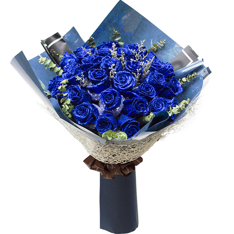 【蓝色迷情】33支精品蓝色妖姬,搭配适量尤加利、情人草。