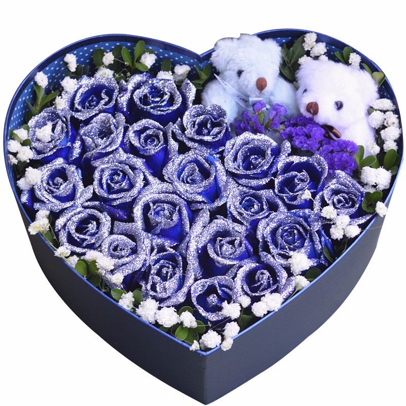 【蓝色妖姬】21支精品蓝色妖姬+2支可爱小熊,搭配适量白色满天星、紫色勿忘我、绿叶。