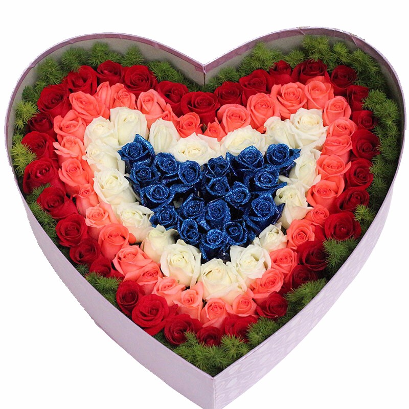 【微笑的天使】99支混色玫瑰(蓝色妖姬、白玫瑰、粉玫瑰、红玫瑰),搭配适量天冬门。