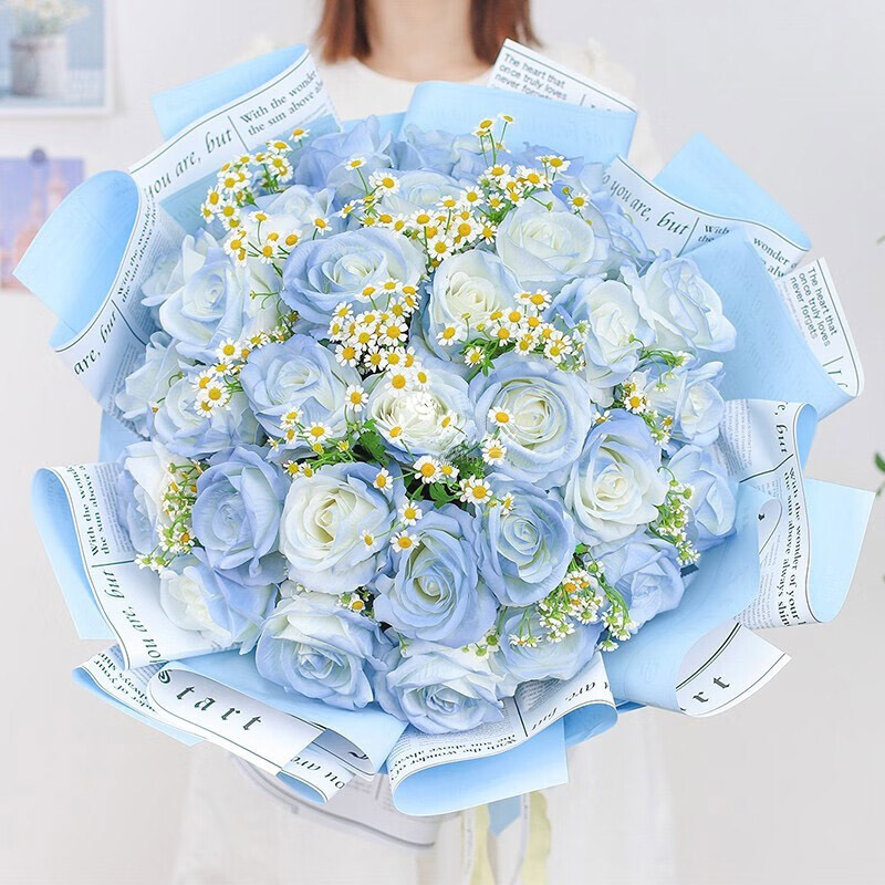 【海中月】精选33枝碎冰蓝玫瑰,洋甘菊装饰(珍贵稀少花材,请提前预订或咨询花艺师)