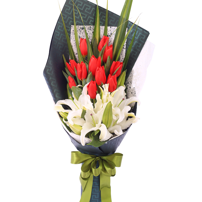 • 【相恋一生】11支精品红色郁金香,搭配3支多头百合。