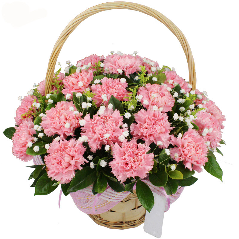 【平安快乐】33枝粉色康乃馨,搭配适量白色满天星、黄莺、栀子叶。