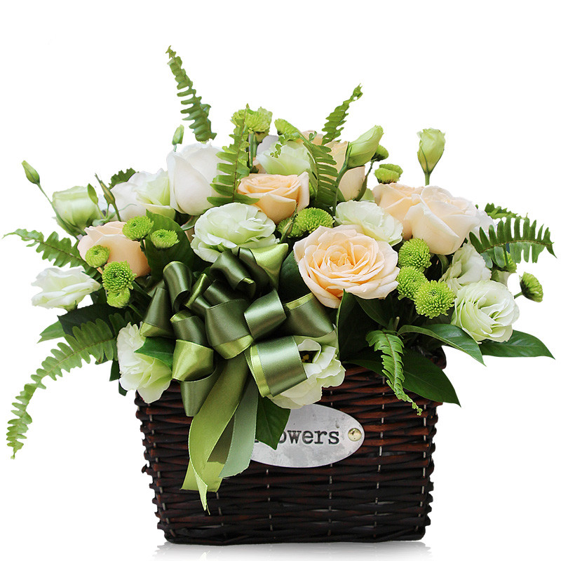 【遥月】9枝精品香槟玫瑰,3朵白玫瑰,6支白桔梗(断货则用6朵白玫瑰代替),绿色小雏菊、栀子叶、大排草装饰,精美绿色缎带蝴蝶结。