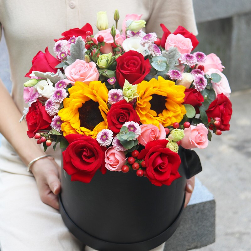 【流光】11朵红玫瑰,11朵红玫瑰,2朵向日葵,搭配桔梗、紫色小雏菊、尤加利叶、红豆、银叶菊装饰。