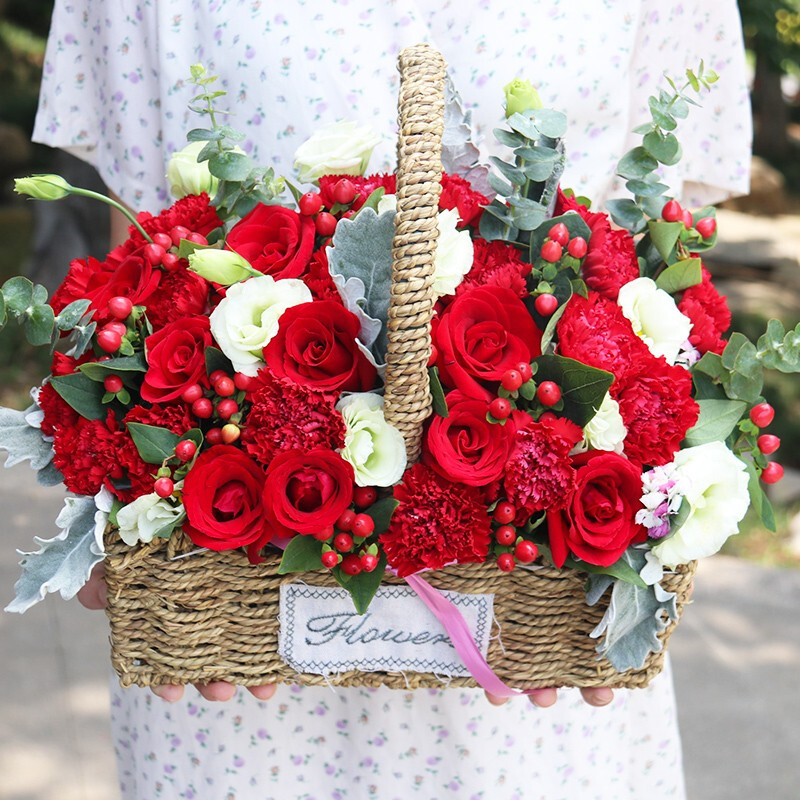 【一圓江月】33朵红色玫瑰、红色康乃馨(其中11朵红玫瑰、22朵红色康乃馨),8支洋桔梗(可用6支白玫瑰代替),搭配红豆、尤加利叶、绿叶、银叶菊装饰。