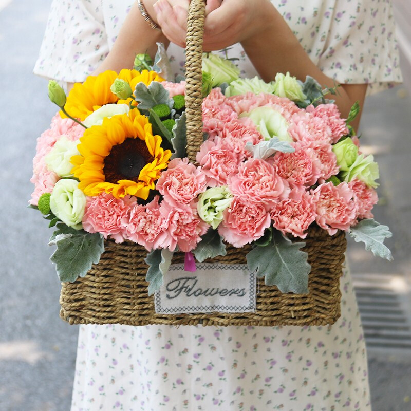 【小桥流水】28朵粉色康乃馨,2支向日葵,5支洋桔梗(可用5支白玫瑰代替),搭配绿叶、银叶菊装饰。