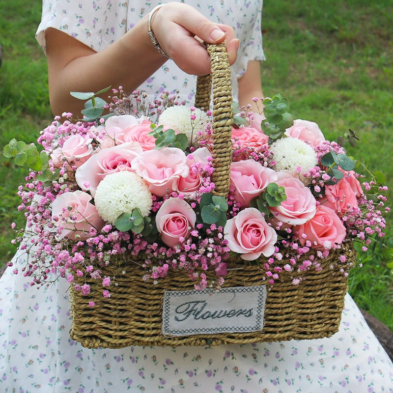 【盈盈满怀】精选16朵粉玫瑰,3支白色乒乓菊(断货则用3支白玫瑰代替),搭配尤加利叶,满天星等点缀丰满。
