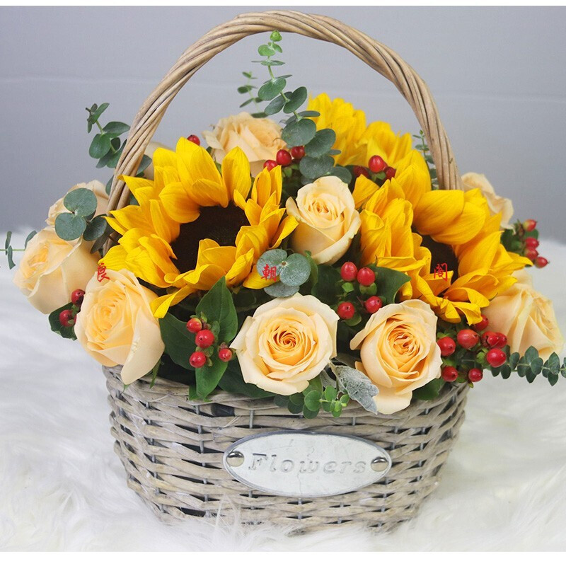 【繁花世界】精选11朵香槟玫瑰,3朵向日葵,搭配红豆、尤加利叶装饰。