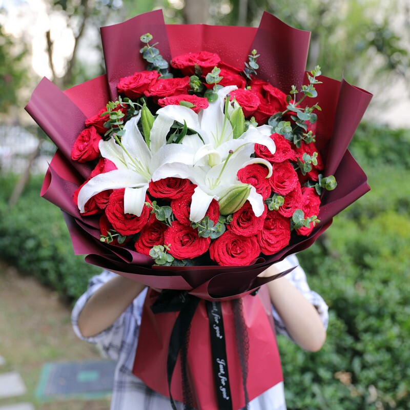 【一生挚爱 】33朵精品红玫瑰,2支多头白色香水百合,搭配尤加利叶装饰。