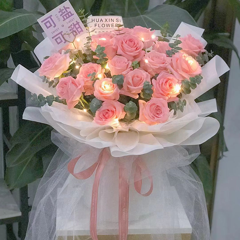 【情定良缘 】19朵精品粉玫瑰,1条灯带,搭配尤加利叶间插。