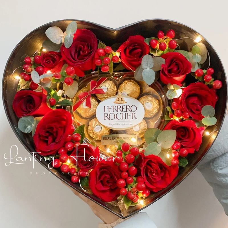 【天长地久】11朵红玫瑰,1条灯串,1盒心形费列罗巧克力,搭配红豆、尤加利叶。