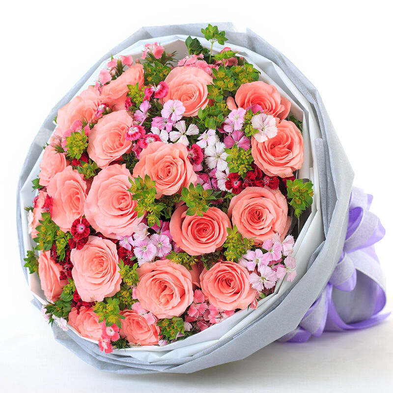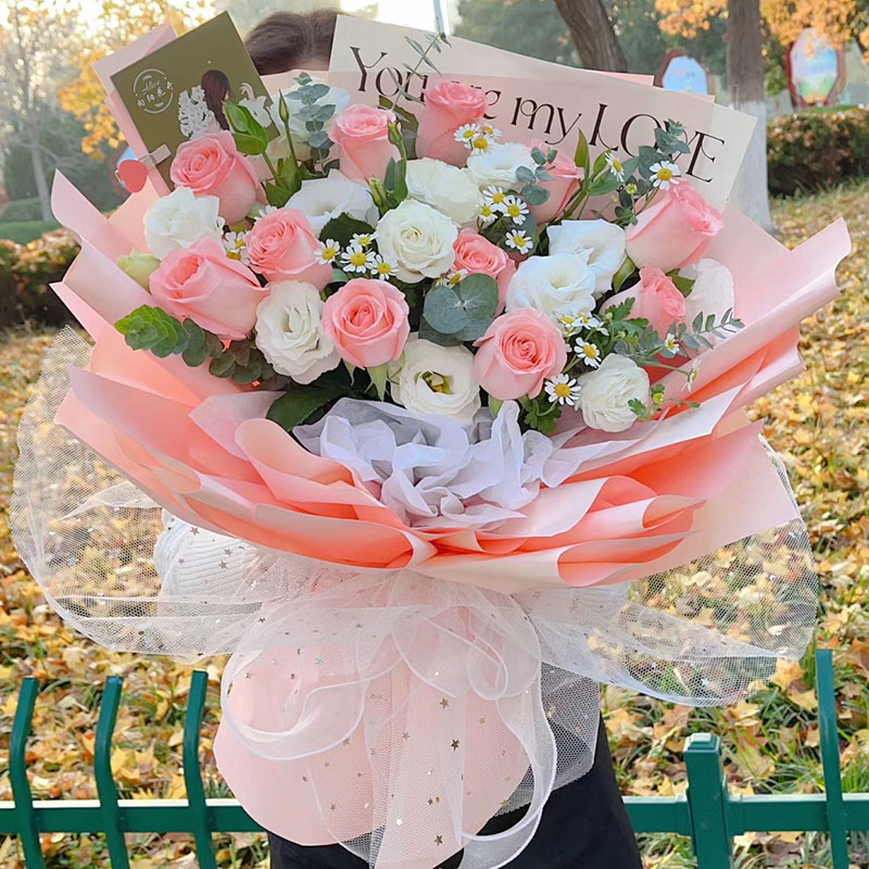 【浓浓深情】精选11朵粉玫瑰、8支洋桔梗(断货则用8支白玫瑰代替),尤加利叶、洋甘菊装饰。