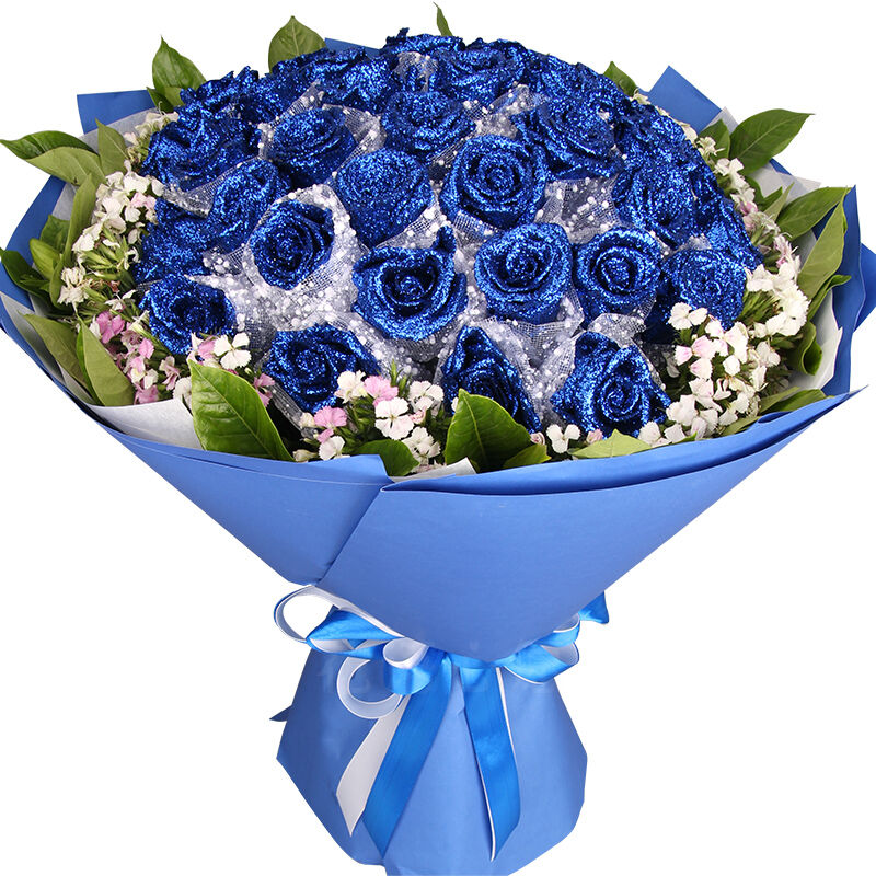 【蓝色精灵】33朵精品蓝玫瑰,相思梅+栀子叶丰满环绕。