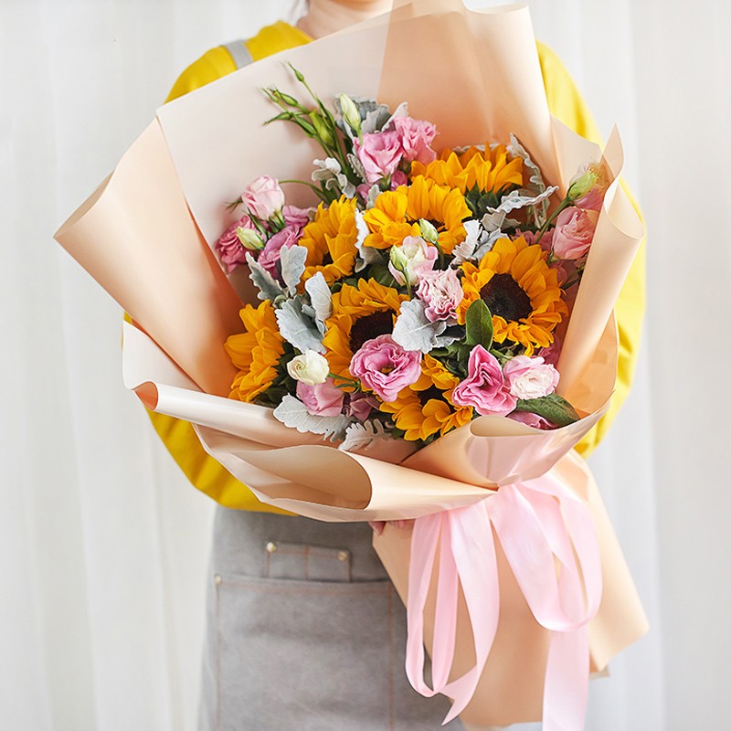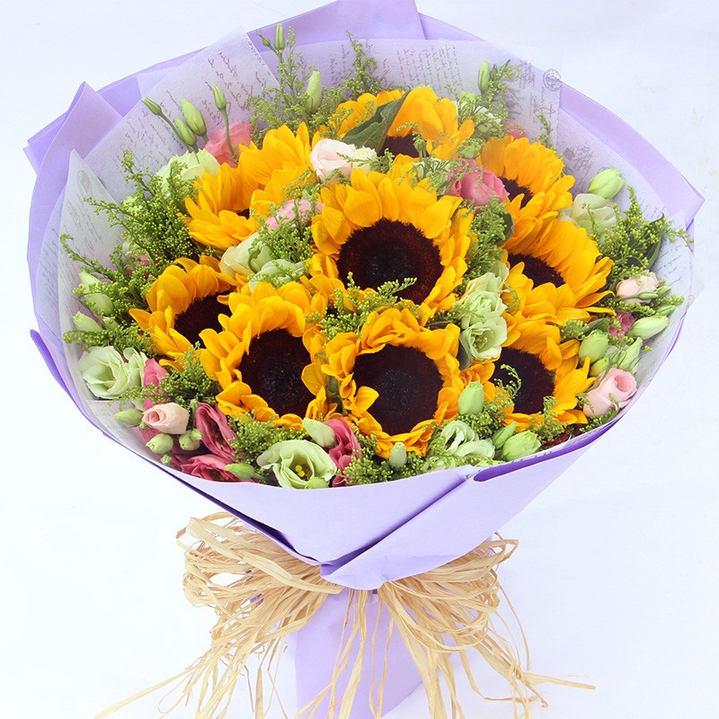 【明媚如你】9支精品向日葵,搭配适量绿桔梗、粉桔梗、黄莺。