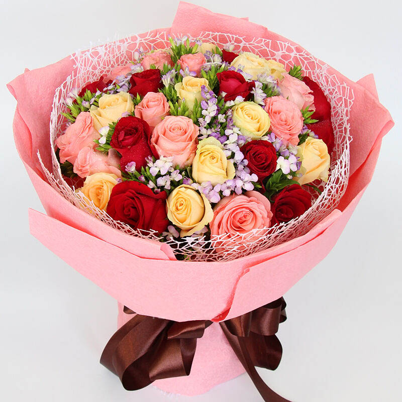 【款款真情】11朵香槟玫瑰,11朵粉玫瑰,11朵红玫瑰,共33朵,相思梅搭配。